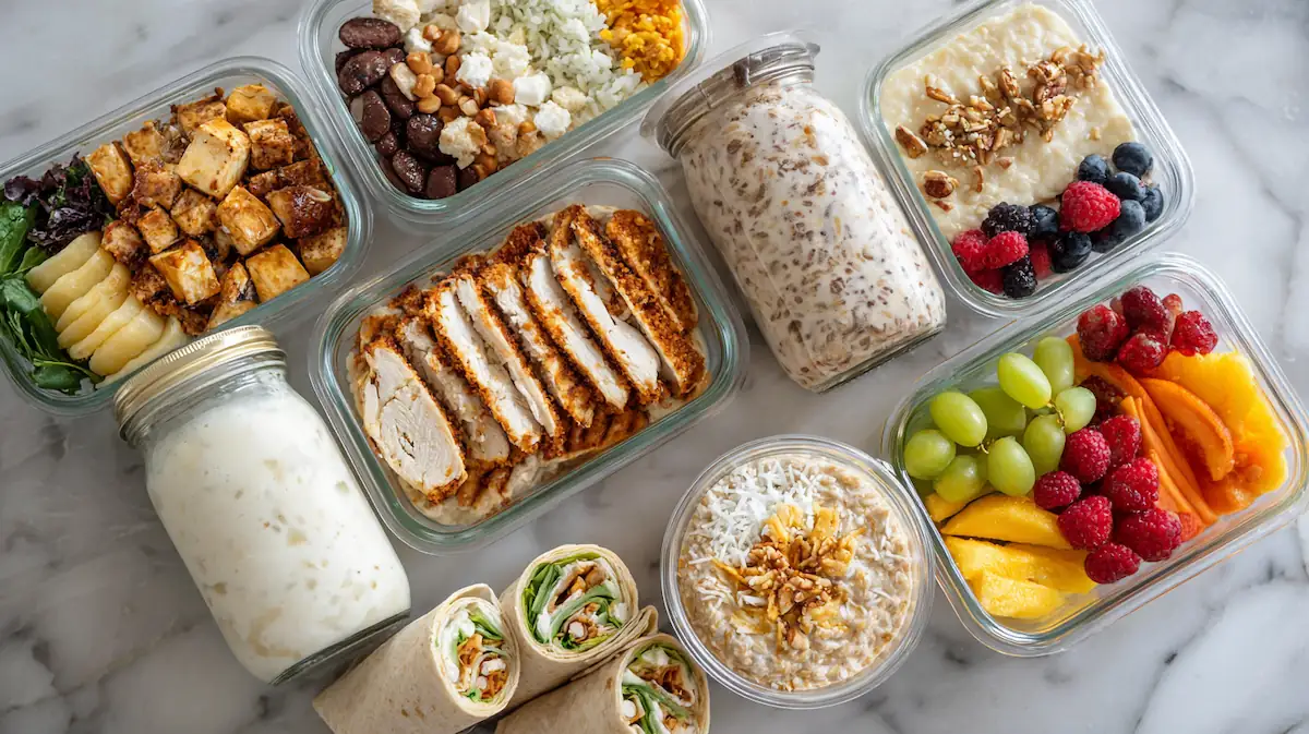 Colorful collage of high protein low calorie meals for students — overnight oats, chicken bowls, smoothies, and wraps arranged on a dorm table
