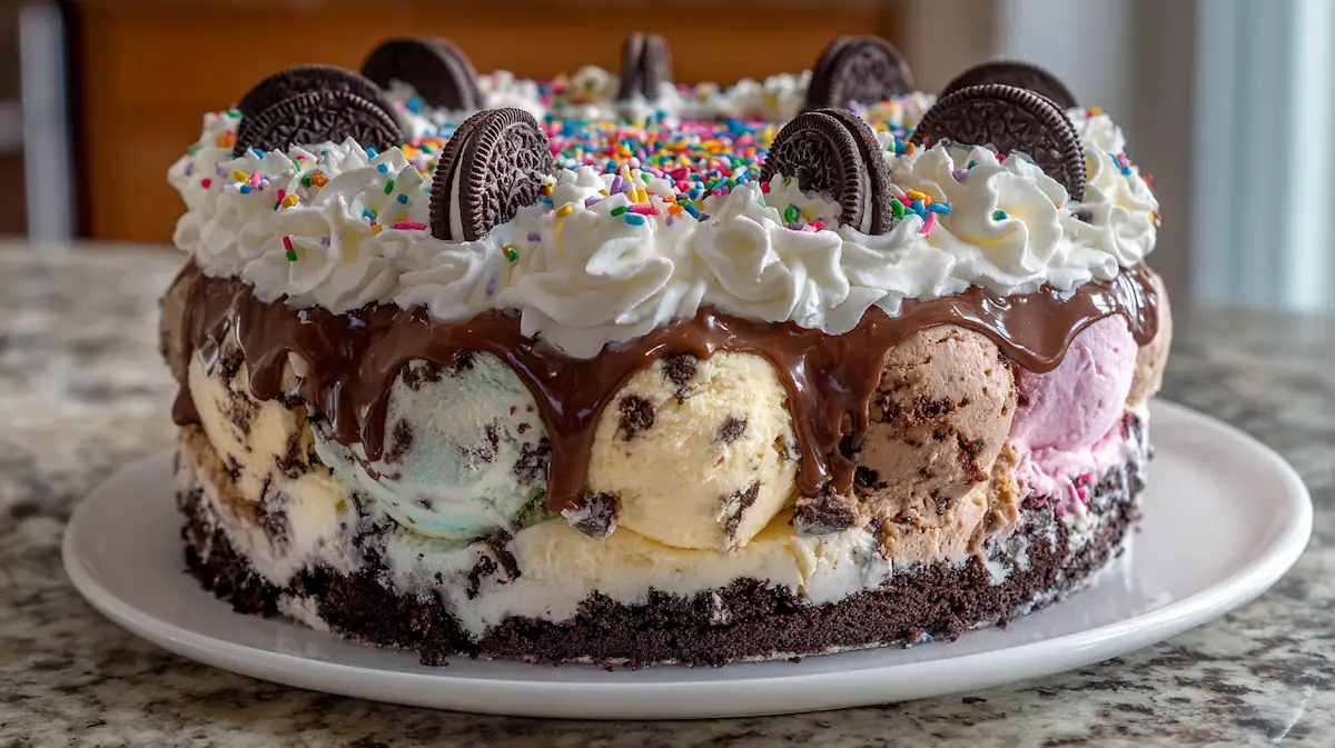 A budget-friendly, no-bake ice cream cake layered with cookie crumbs, two ice cream flavors, and fluffy whipped topping. Perfect for dorm kitchens, birthdays, and study sessions.