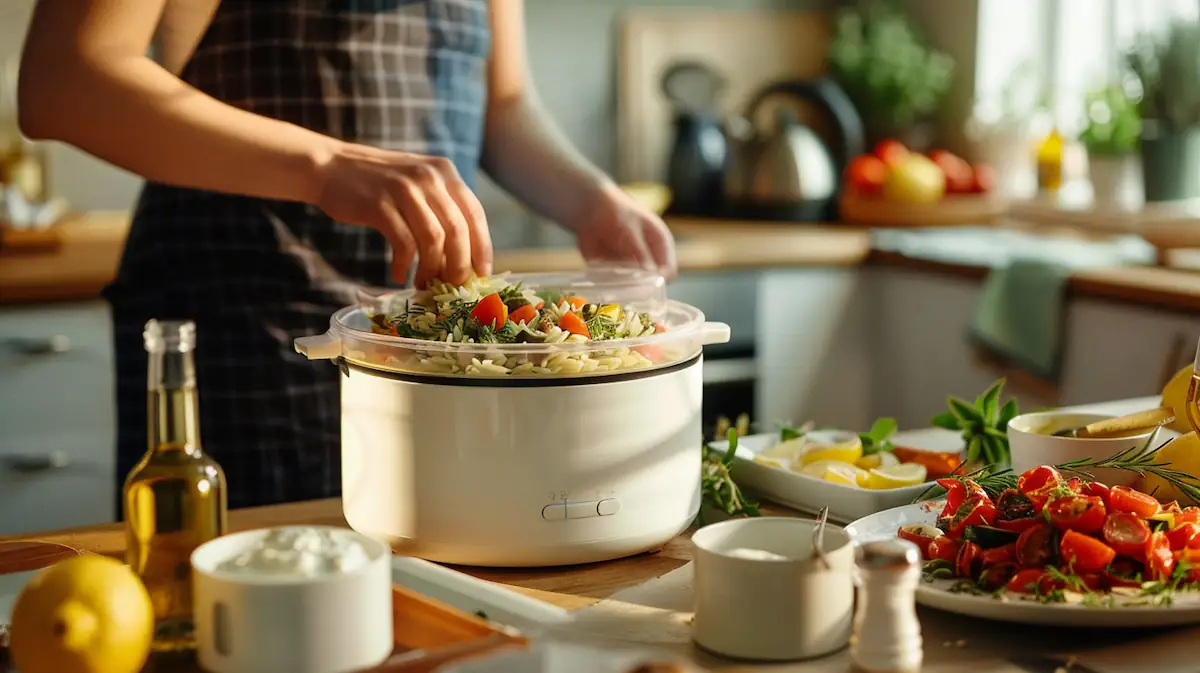 2. 15-Min Lemon Orzo (Rice Cooker) — Orzo + water/broth; stir in lemon juice, frozen spinach, parmesan/feta.